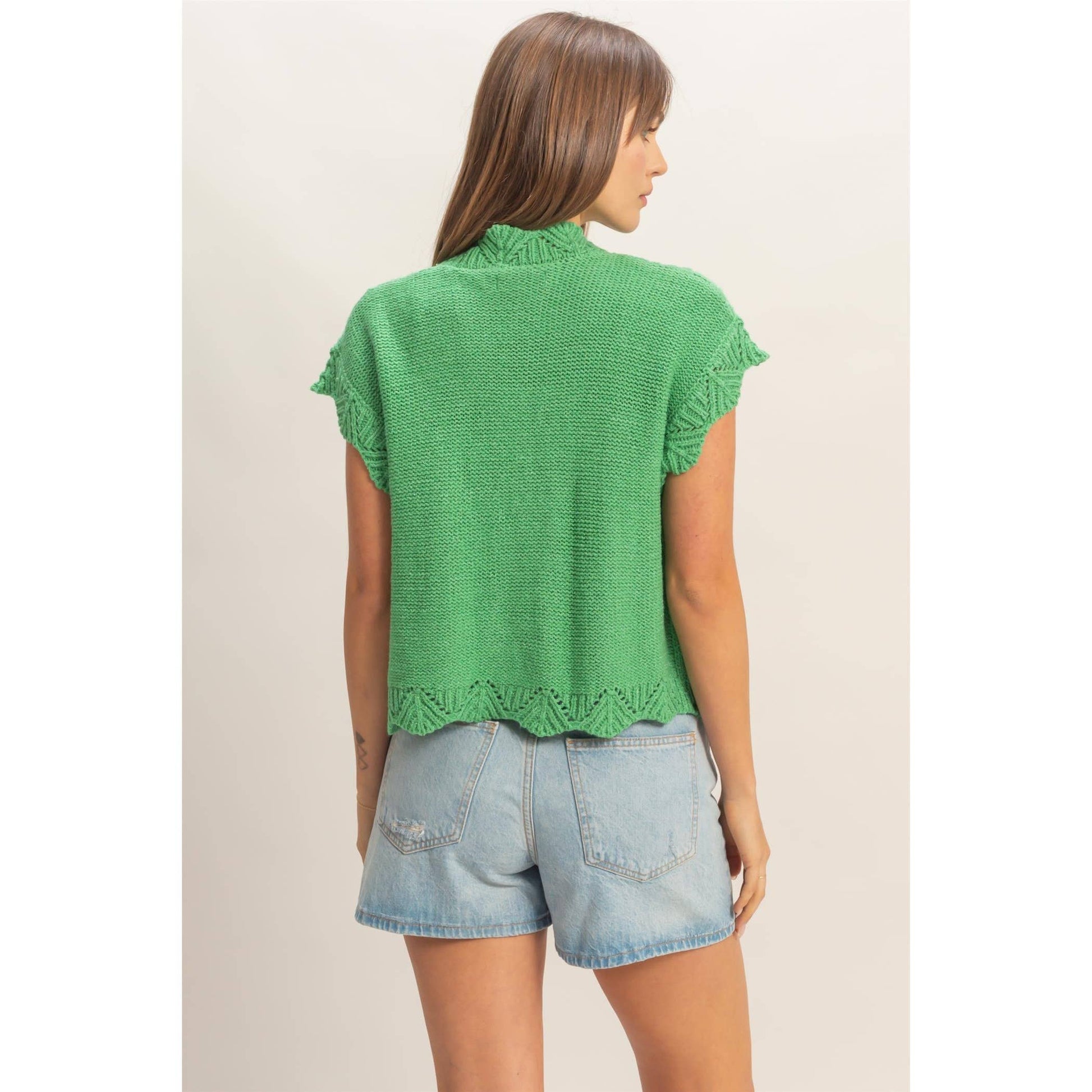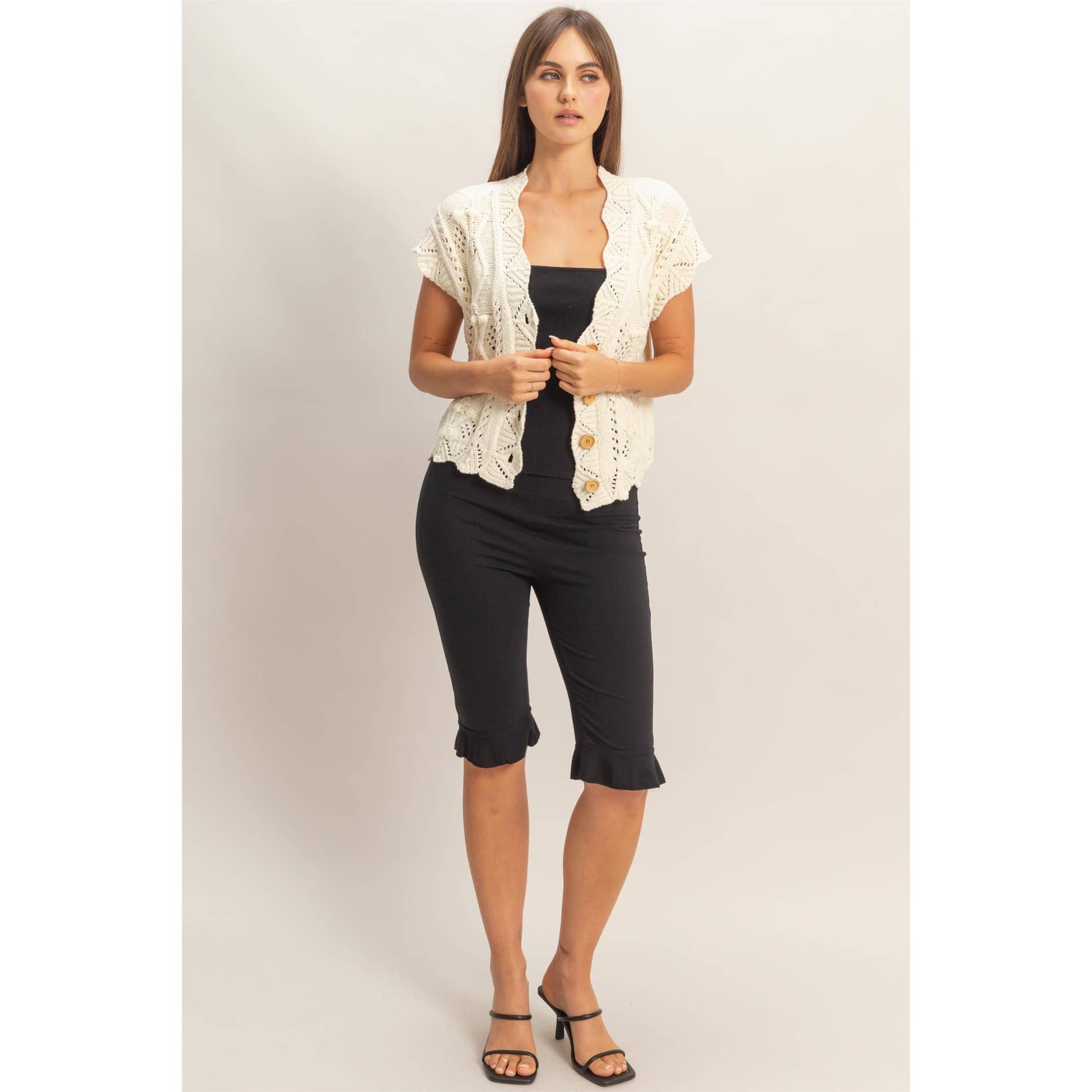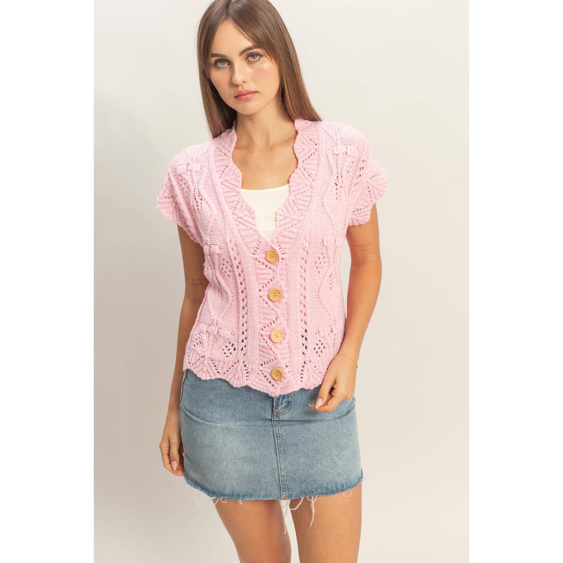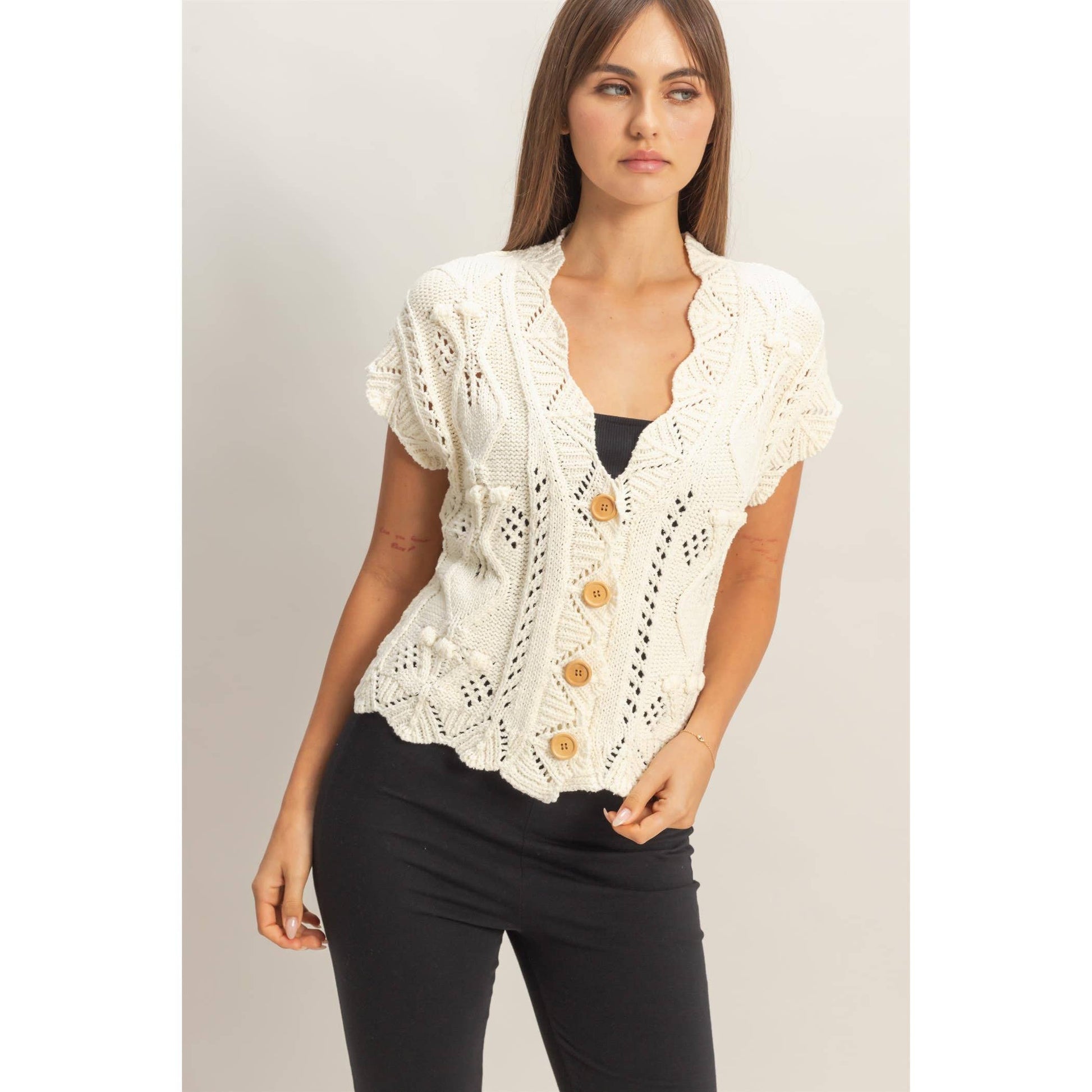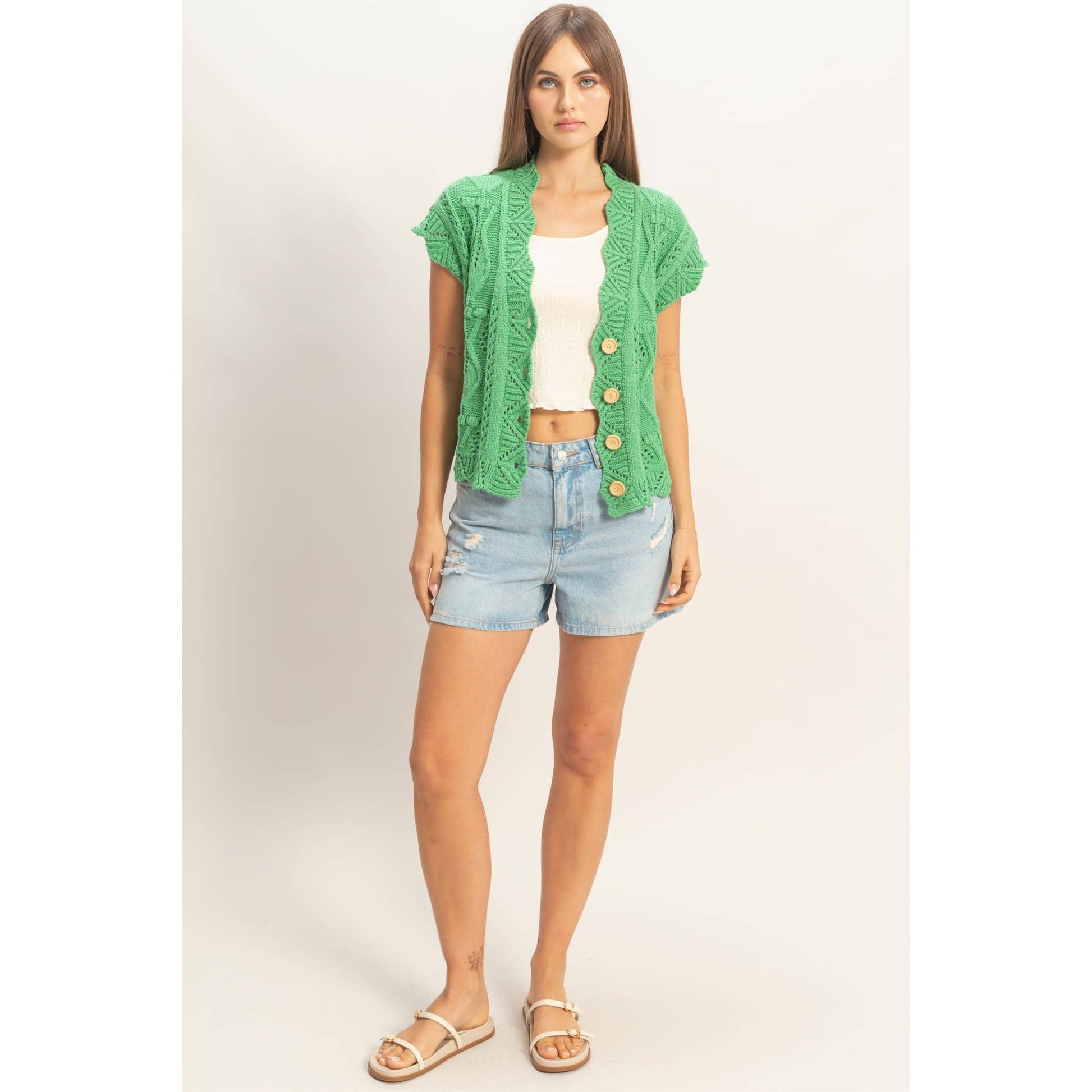This short-sleeve crochet sweater features a scalloped trim and large wooden buttons. Pair with high-waisted denim shorts for a relaxed summer vibe.