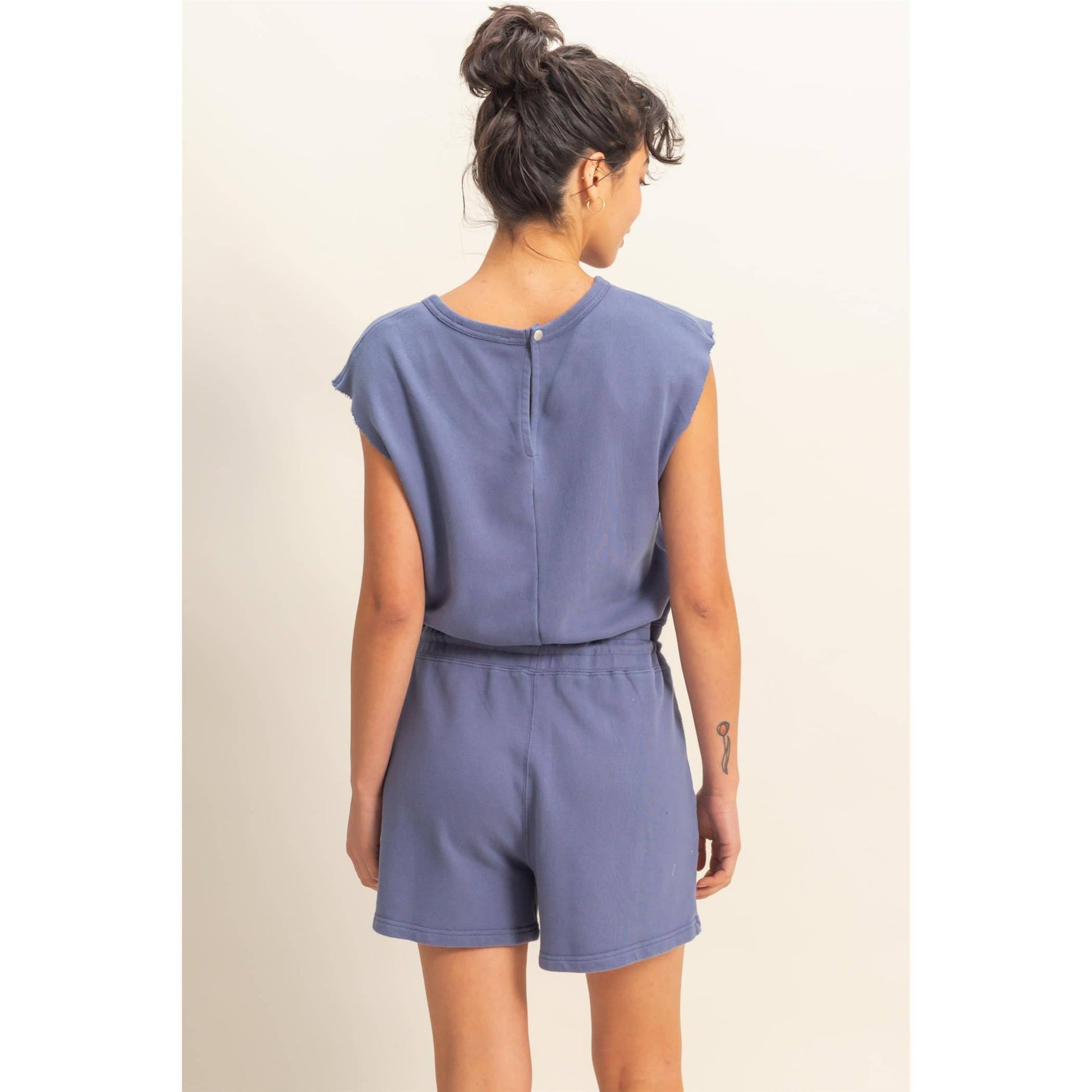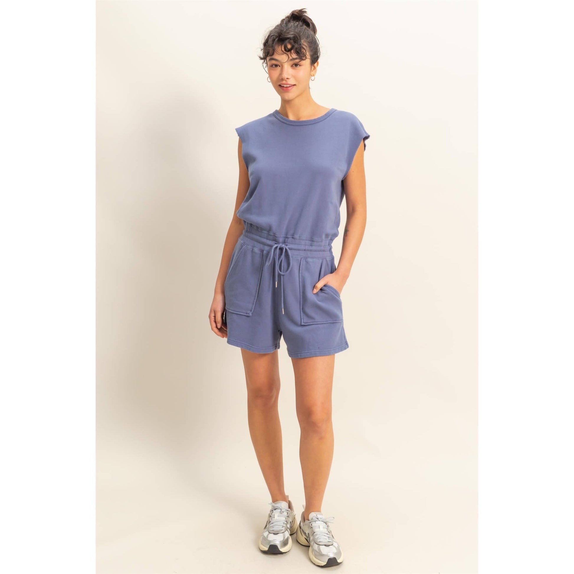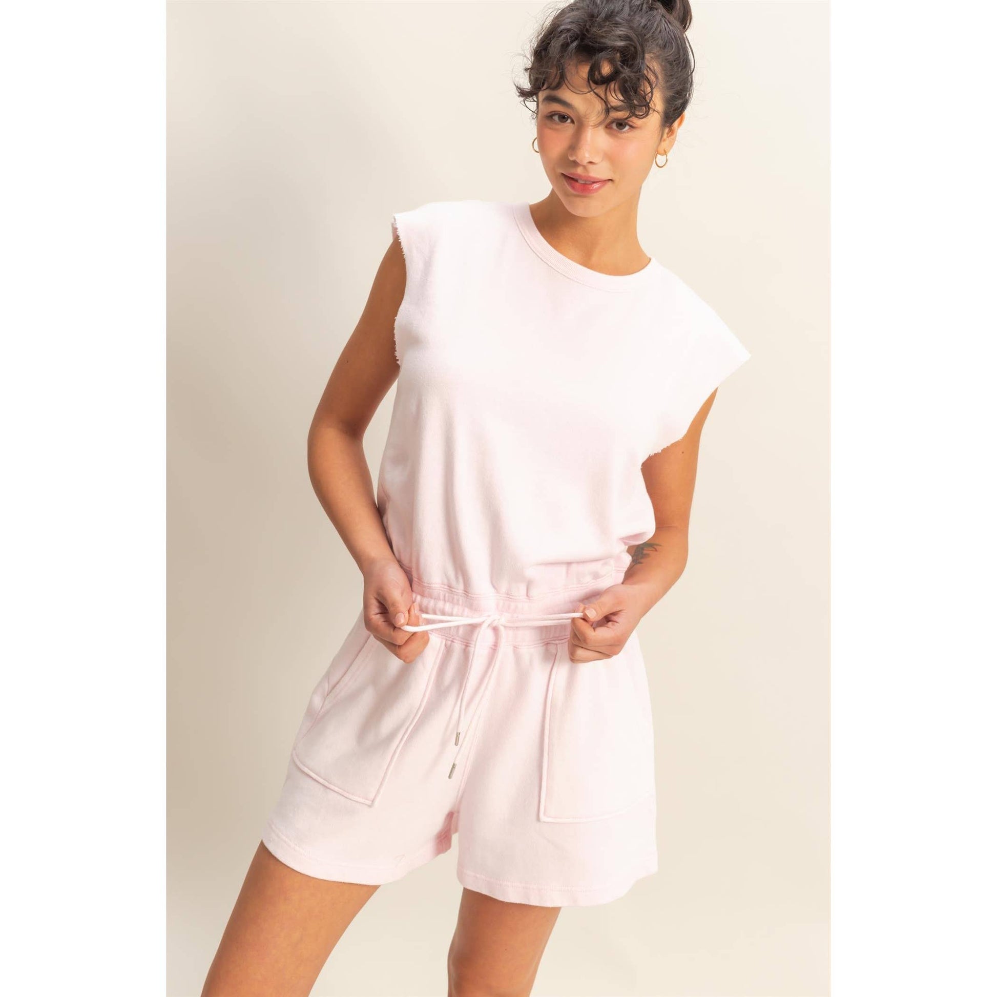 Its Easy To Look Cute When You Have This Romper In Your Closet. The Round Neckline Leads To A Sleeveless Cut Bodice With A Relaxed Fit. The Elasticized Waist Is Cinched In With A Drawstring, Before Ending In Loose Short Legs.