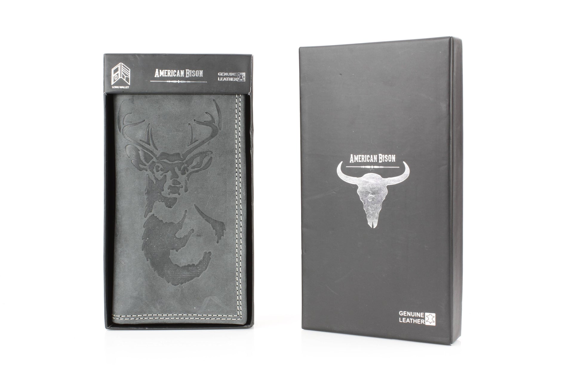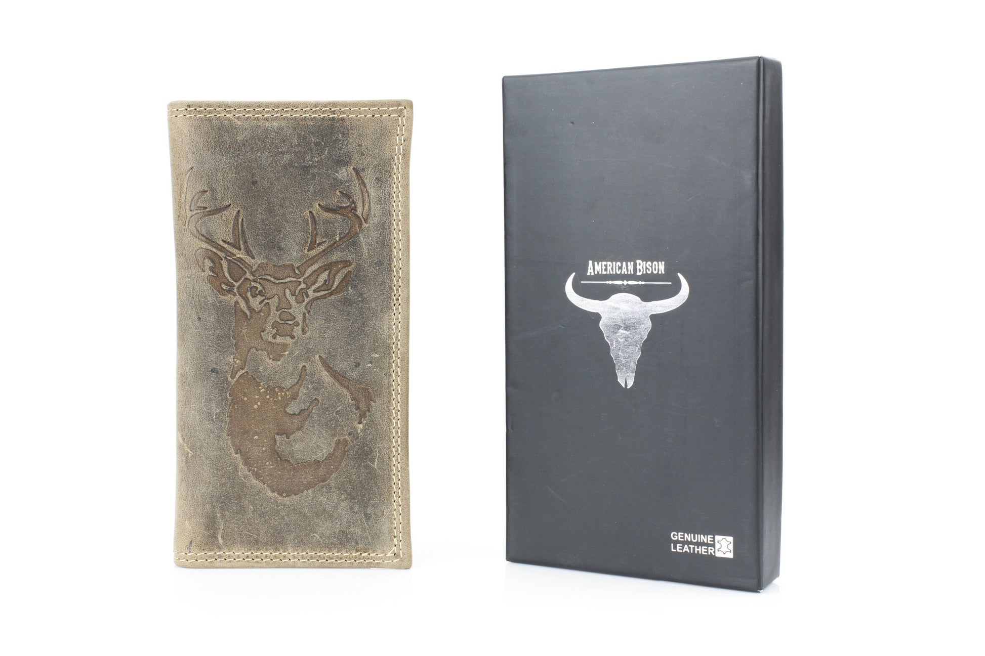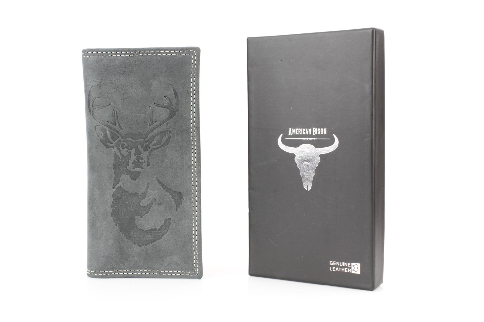 The American Bison men’s rodeo wallet is crafted from premium hunter leather, designed to deliver both durability and Western style. Featuring bold white double top-stitching, it creates a rugged contrast against the smooth leather finish. The front is embossed with a striking deer and antler design, making it a perfect piece for outdoorsmen and those who appreciate rustic detail. Inside, the tall rodeo-style layout offers smart organization, including one clear ID slot, nine credit card slots, and four vertical compartments for cash, receipts, or notes. With its slim yet spacious structure, this wallet is built for everyday use while keeping your essentials neatly arranged. Packaged in a sturdy cardboard box, it makes a practical and thoughtful gift. Available in black and brown.