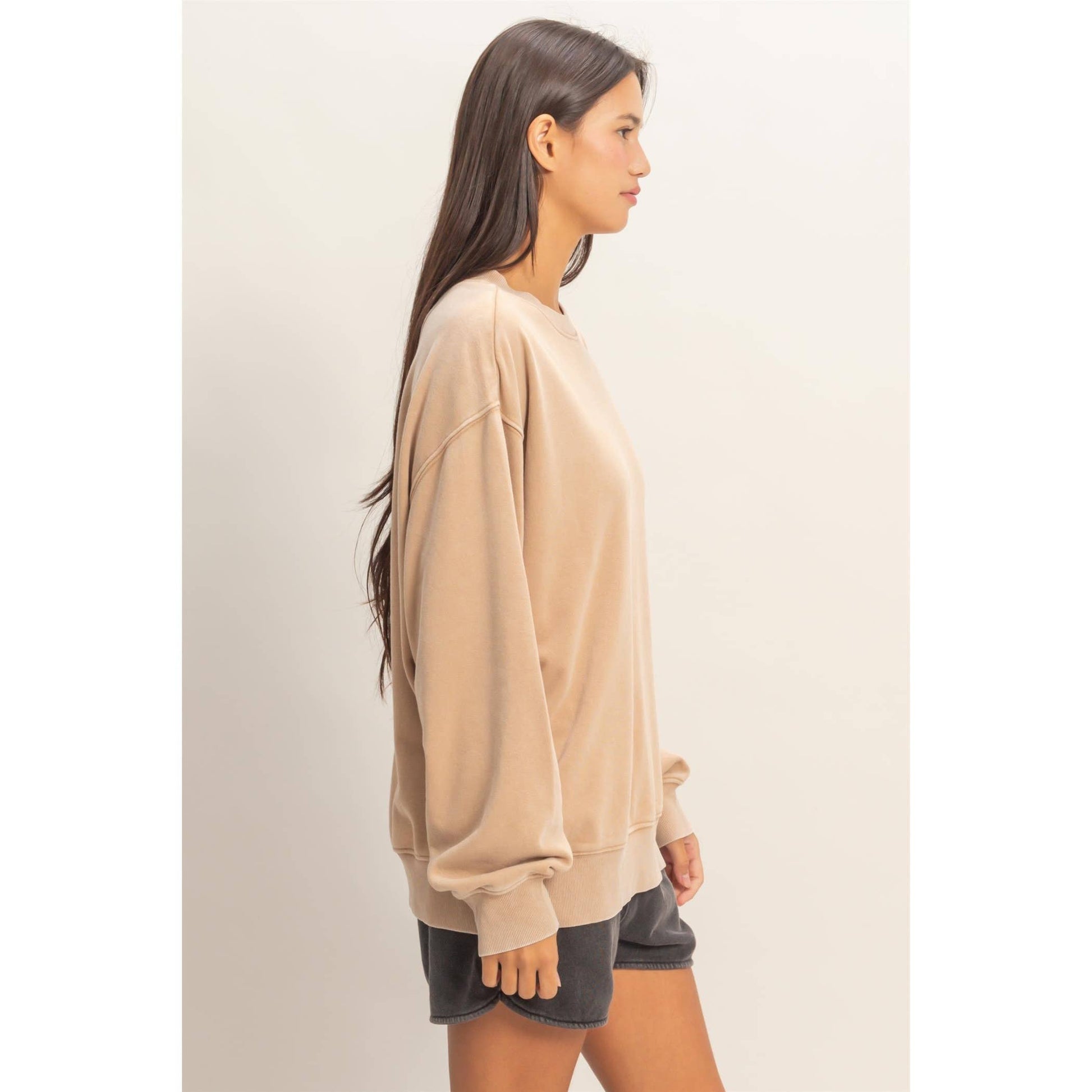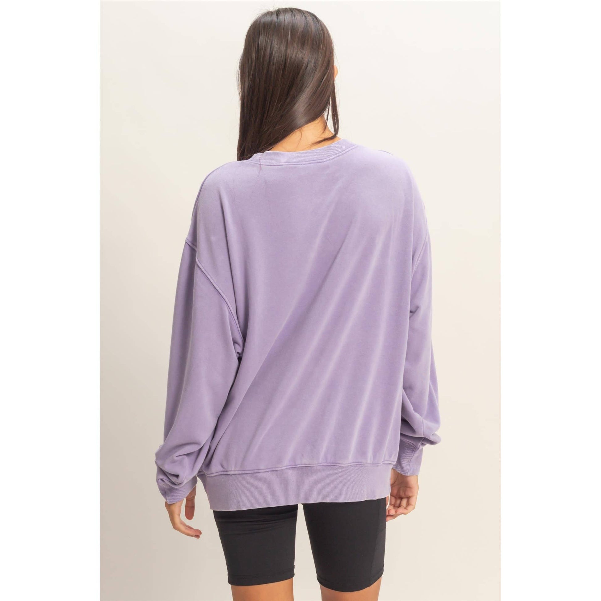 This essential sweatshirt offers ultimate comfort with soft French terry, featuring a mineral washed finish providing a faded, vintage texture. The design includes a ribbed crew neckline and dropped shoulders with full long sleeves and ribbed cuffs. With an oversized and relaxed fit, it pairs perfectly with joggers and sneakers for a laid-back look. Self : 80% Cotton / 20% Polyester Contrast : 95% Cotton / 5% Spandex Model Is 5' 7" Tall, 32" Chest, 23" Waist, 34" Hips And Wearing A Size Small Imported. Designed In The USA