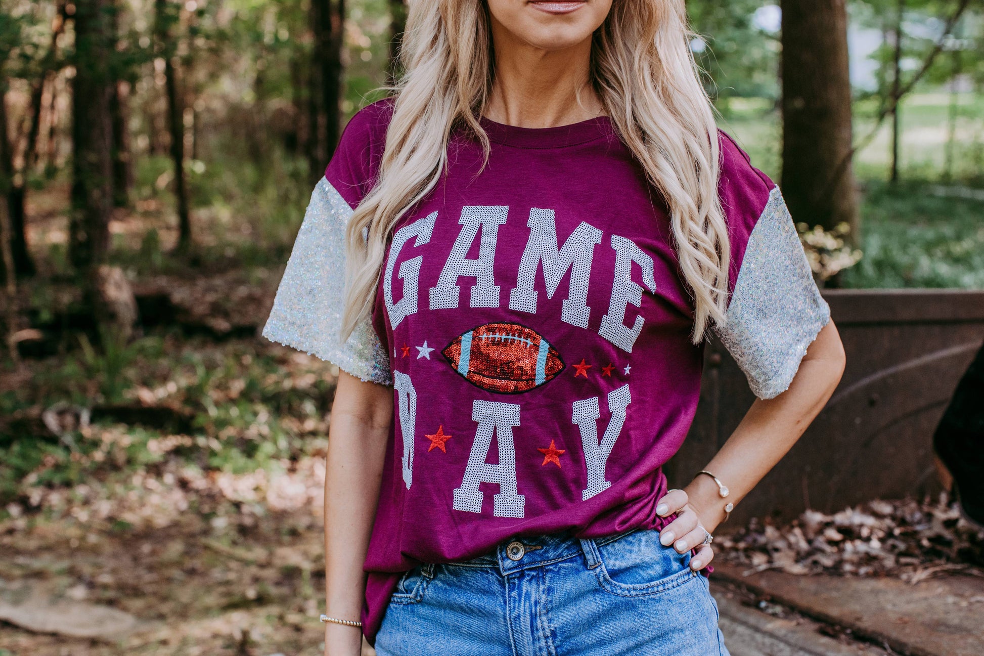 Sequins Sleeve Game Day Tee from Merigold Kiss. This isn't your average tee; it elevates the traditional t-shirt with sequin sleeves, adding a touch of glamour. Merigold Kiss Wholesale is a family-owned Texas-based western inspired lifestyle clothing brand serving retail boutiques nationwide.