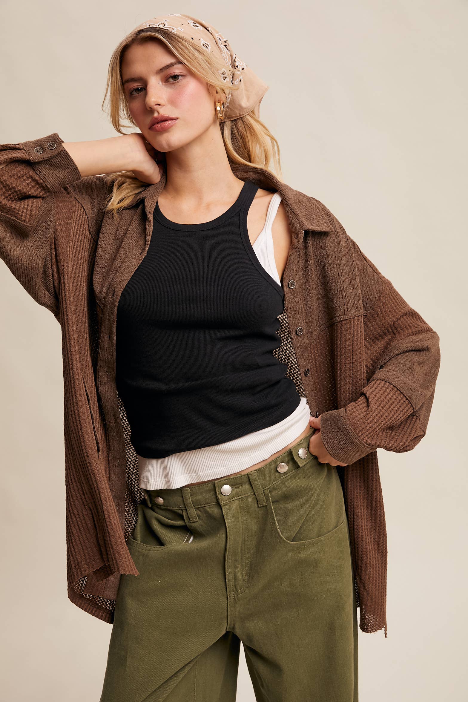 Textured Waffle Knit: Soft cotton-blend knit with a cozy, dimensional feel - Relaxed Oversized Fit: Drop shoulders and roomy cut for laid-back comfort - Snap Button Front: Easy-to-layer closure with matte snap buttons - Collared Neckline: Adds structure and a touch of classic tailoring - Side Pockets: Discreetly integrated for functional wear - Raw-Edge Hem: Subtly distressed finish gives a casual, lived-in look - Model is 5' 7" 34-24-34 and wearing a size Small With a Western-inspired casual vibe, this versatile Top works perfectly as a light layer over tanks or dresses, or buttoned up as a cozy stand-alone statement. Whether styled with Cargo Pants or over a Graphic Tee, it brings effortless texture to your everyday lineup.